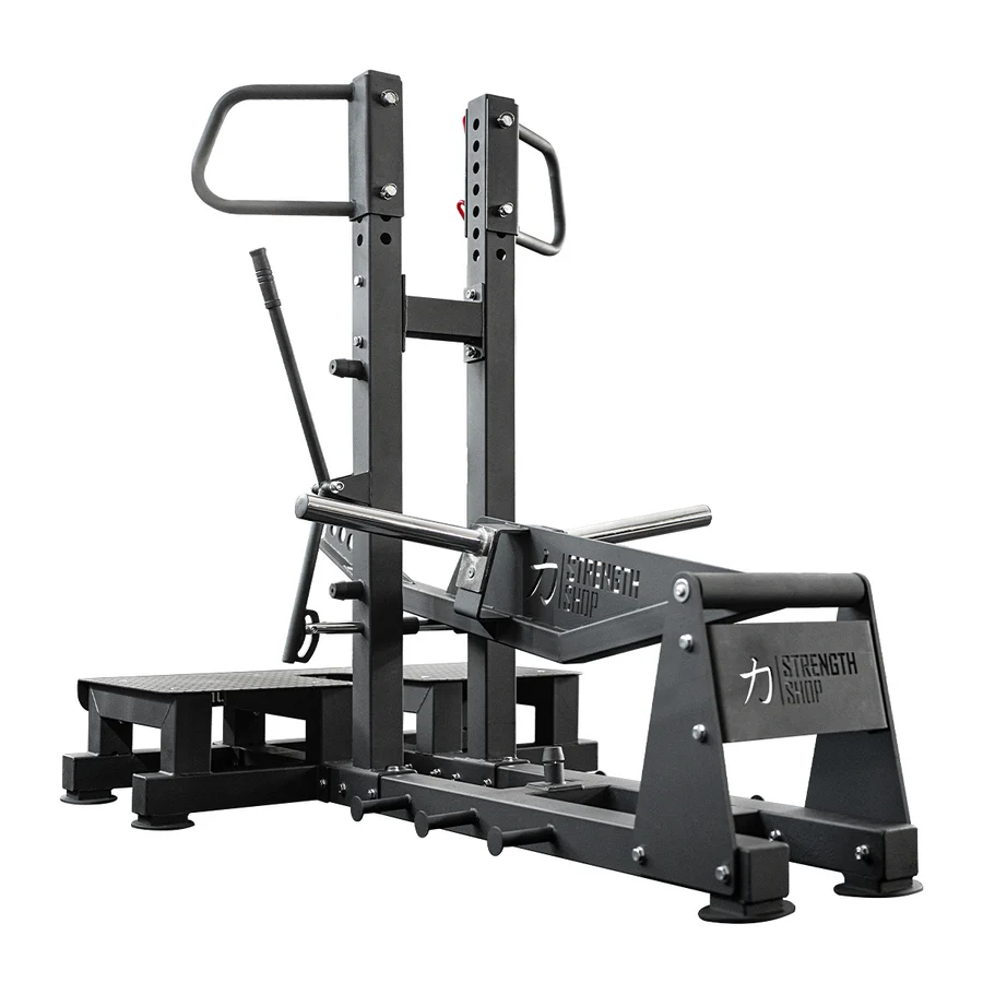 Model Riot wyróżnia się wyjątkowo dużą platformą z łezkowatej blachy stalowej, która daje pełną swobodę w doborze szerokości rozstawu stóp – od wąskiego po bardzo szeroki (sumo). System dźwigni oparty jest na wzmocnionych łożyskach, co zapewnia idealnie gładki tor ruchu. Długie ramię do blokowania i odblokowywania ciężaru jest łatwo dostępne z pozycji stojącej, co zwiększa bezpieczeństwo podczas bicia rekordów. Dodatkowo, maszyna posiada boczne tuleje do przechowywania talerzy, co zwiększa jej masę własną i stabilność podczas pracy.